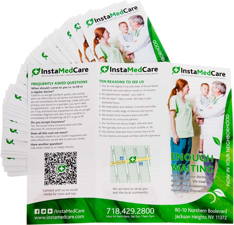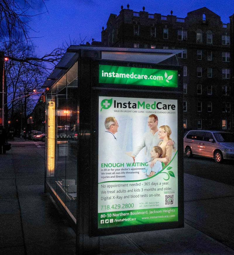 Needless to say, in this age of smartphones and a myriad of other distractions, the design and the message have to be compelling; otherwise, that investment is wasted. Client needed an arresting idea or a call to action that people would remember and associate with the InstaMedCare urgent care clinic. Alex Karasev came up with "ENOUGH WAITING." This poster design features a Green Wave concept and design pattern we created and articulated for InstaMedCare to use in all media (see the next image). | ![]() |