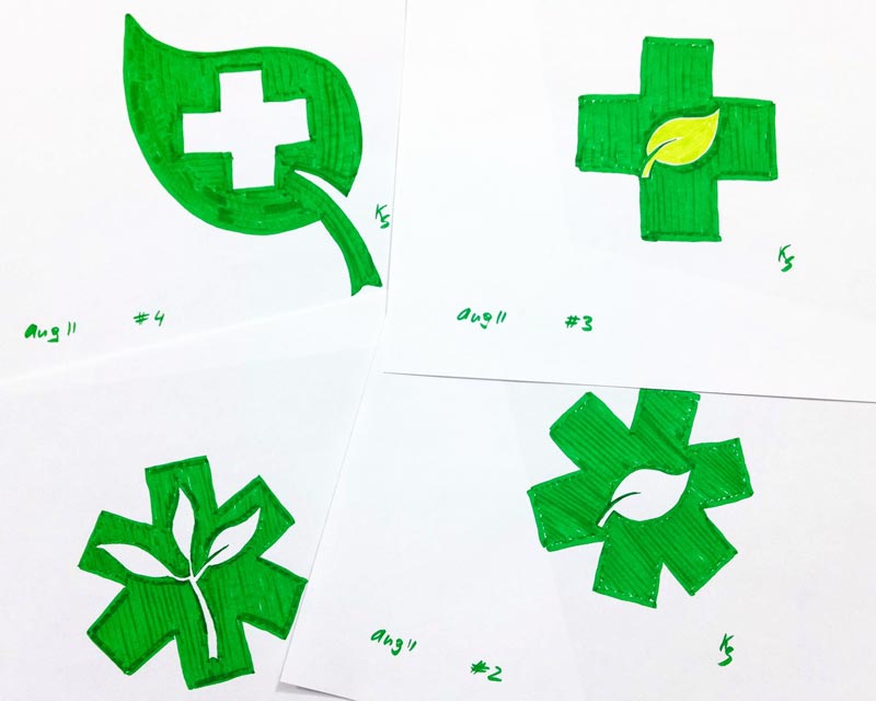 Alex Karasev selected a green color scheme that fit the look of the office and its personality, in a complete departure from their former red cross design. The brand message, therefore is, "InstaMedCare is a dynamic and bright place where patients come to get better, to regain their vitality." Alex Karasev has sketched several logo variants, combining leaves and medical symbols. | ![]() |